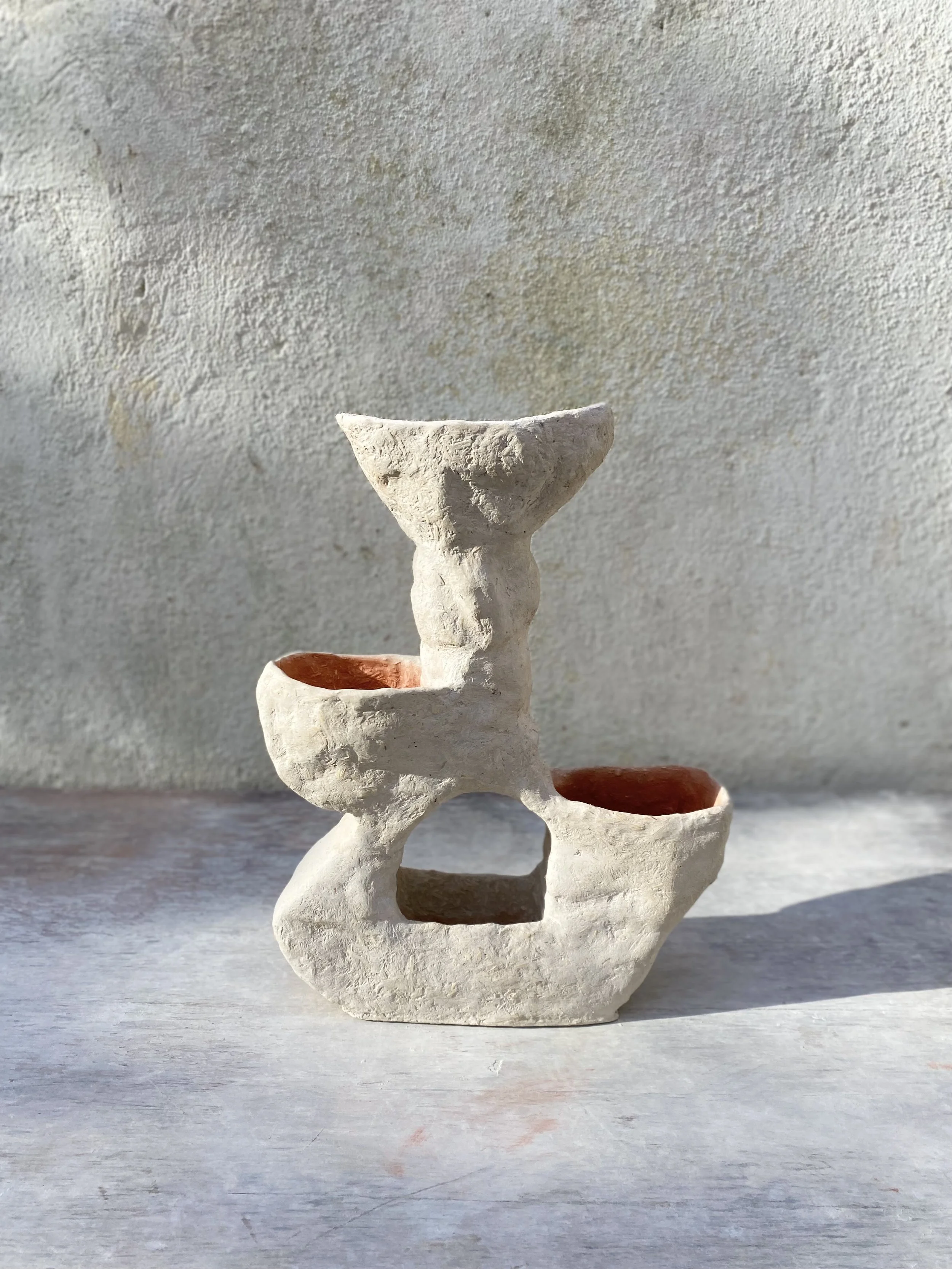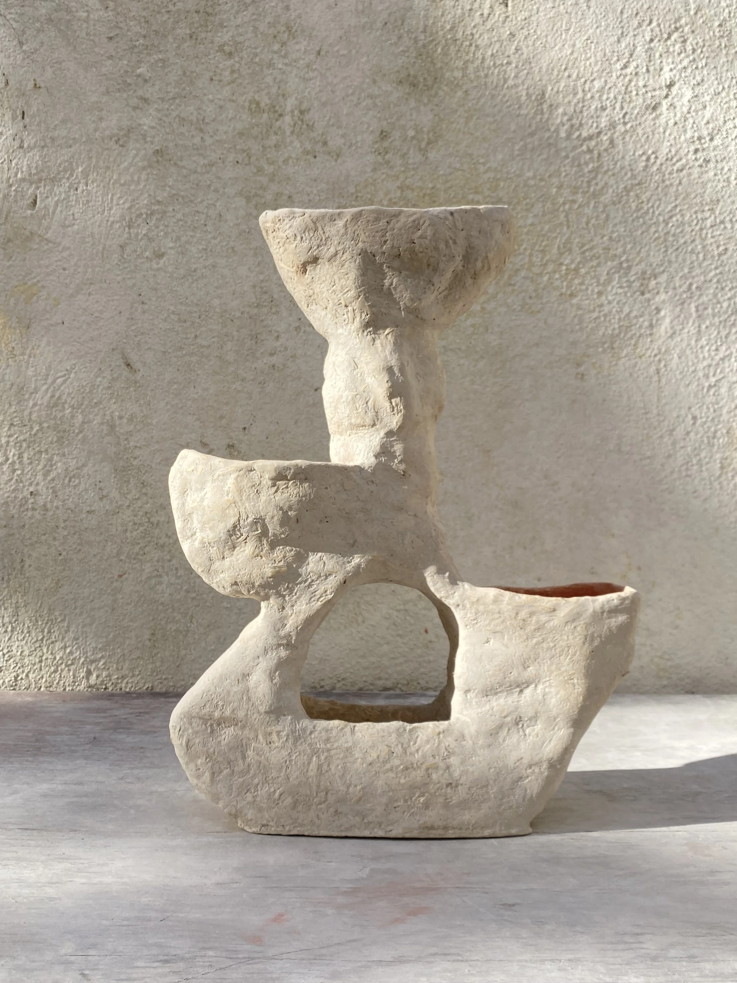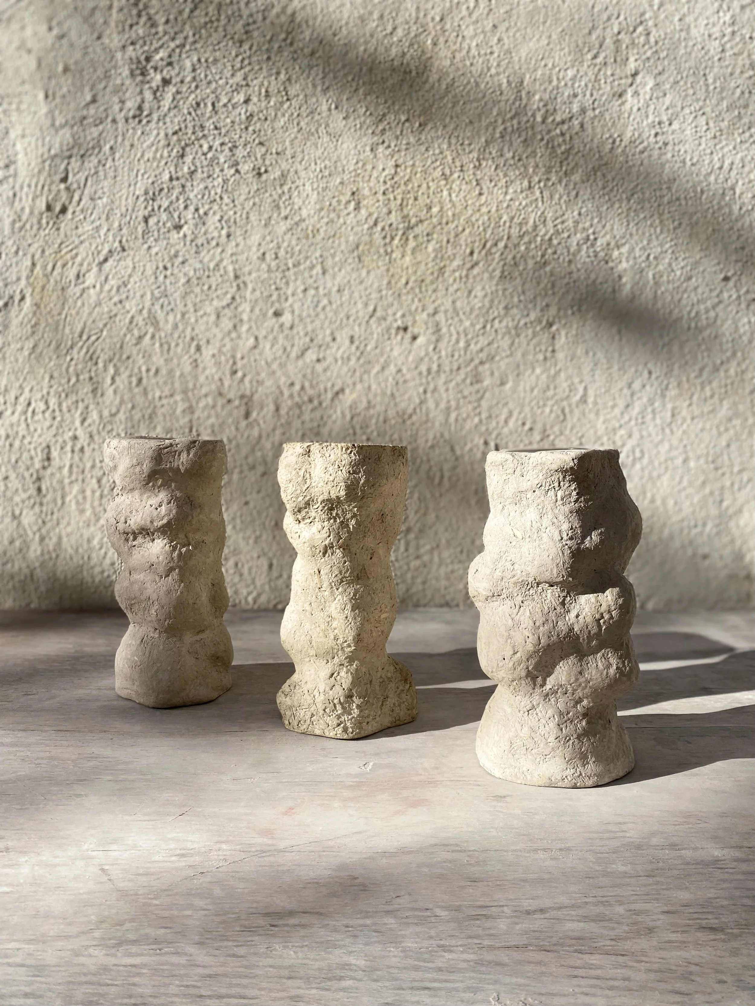 Une collection sculpturale qui réinvente la frontière entre vase et cache-pot. Trois pièces complémentaires aux formes uniques, façonnées en béton de chanvre pour sublimer plantes et fleurs.