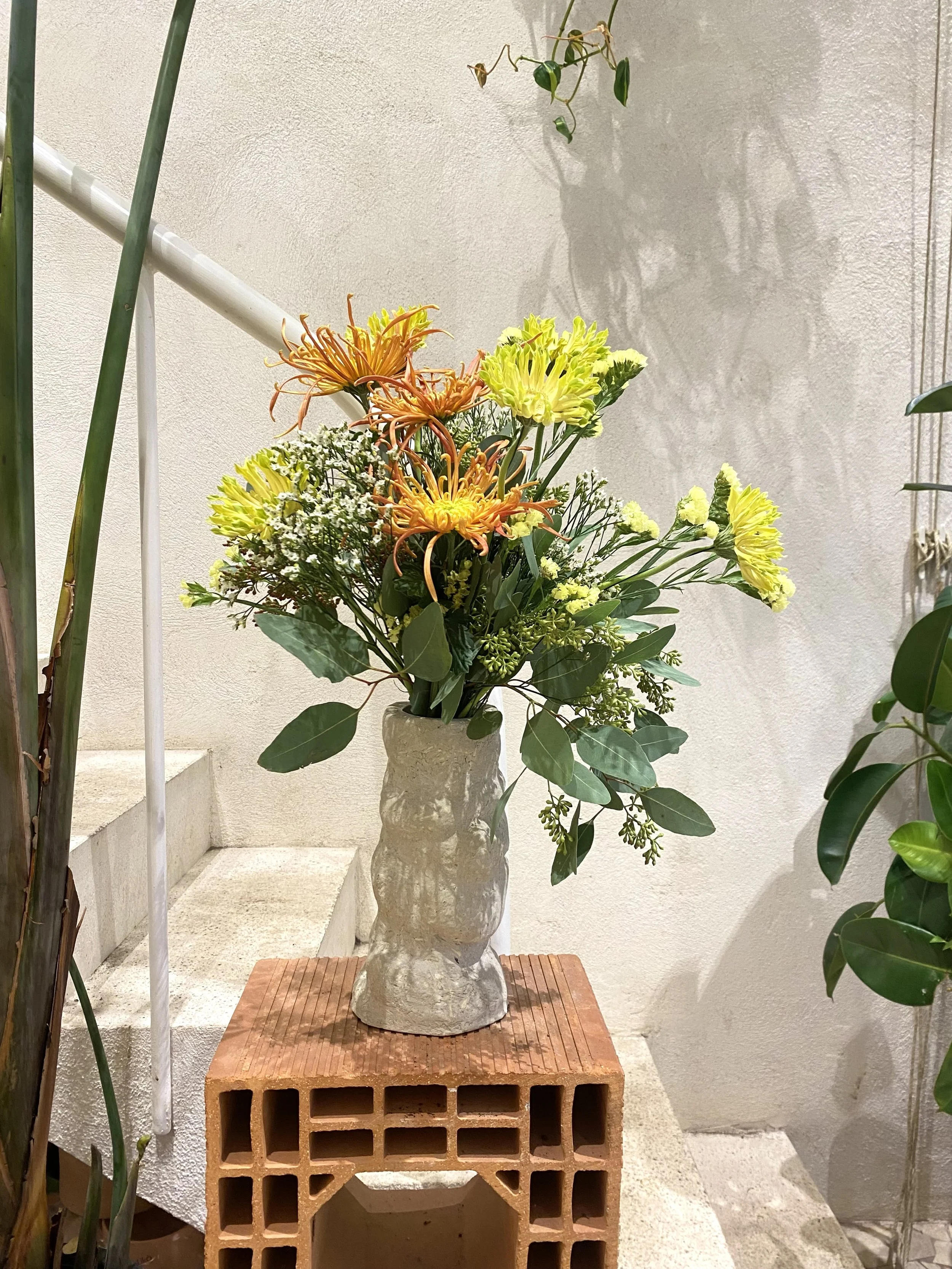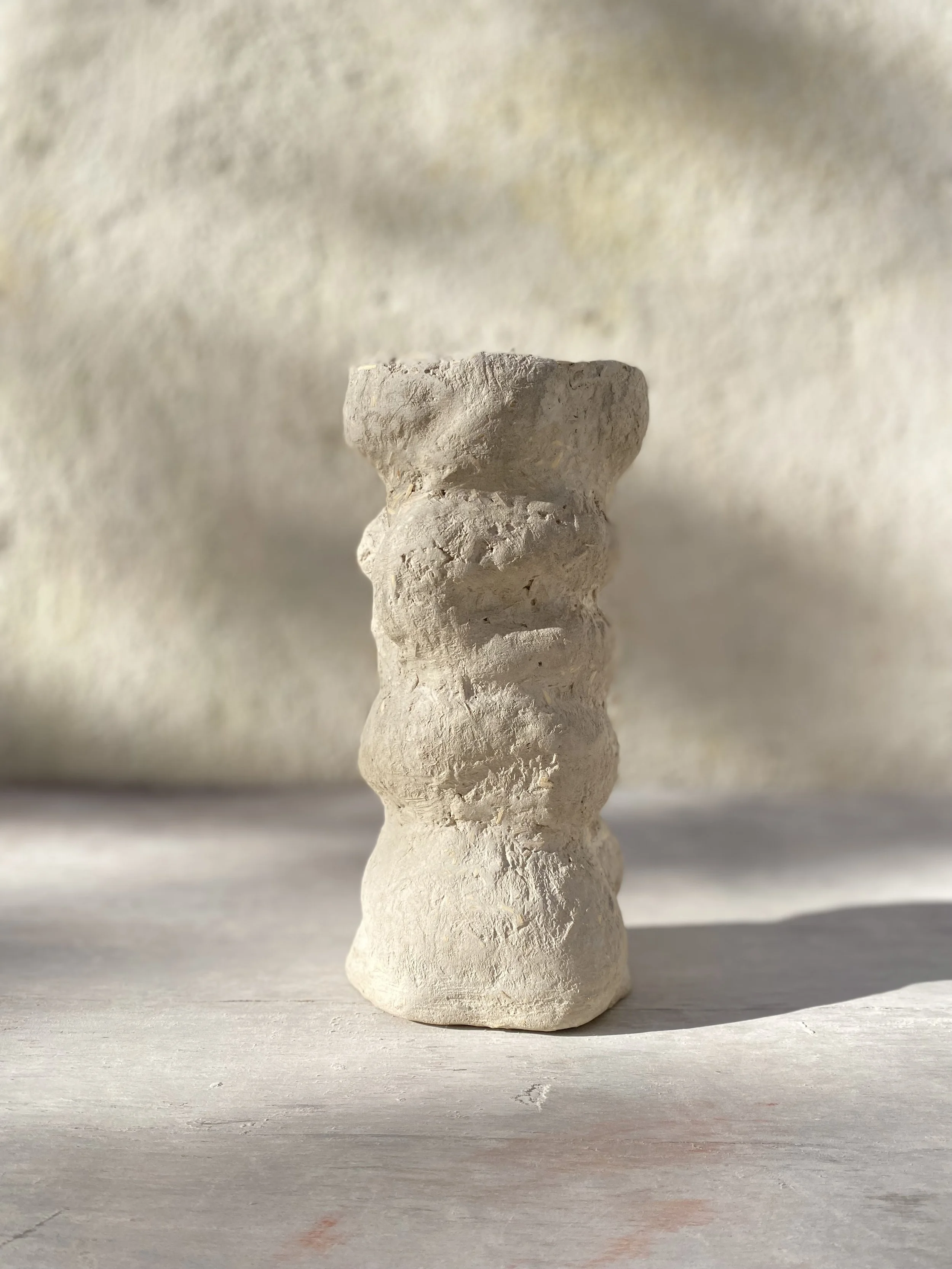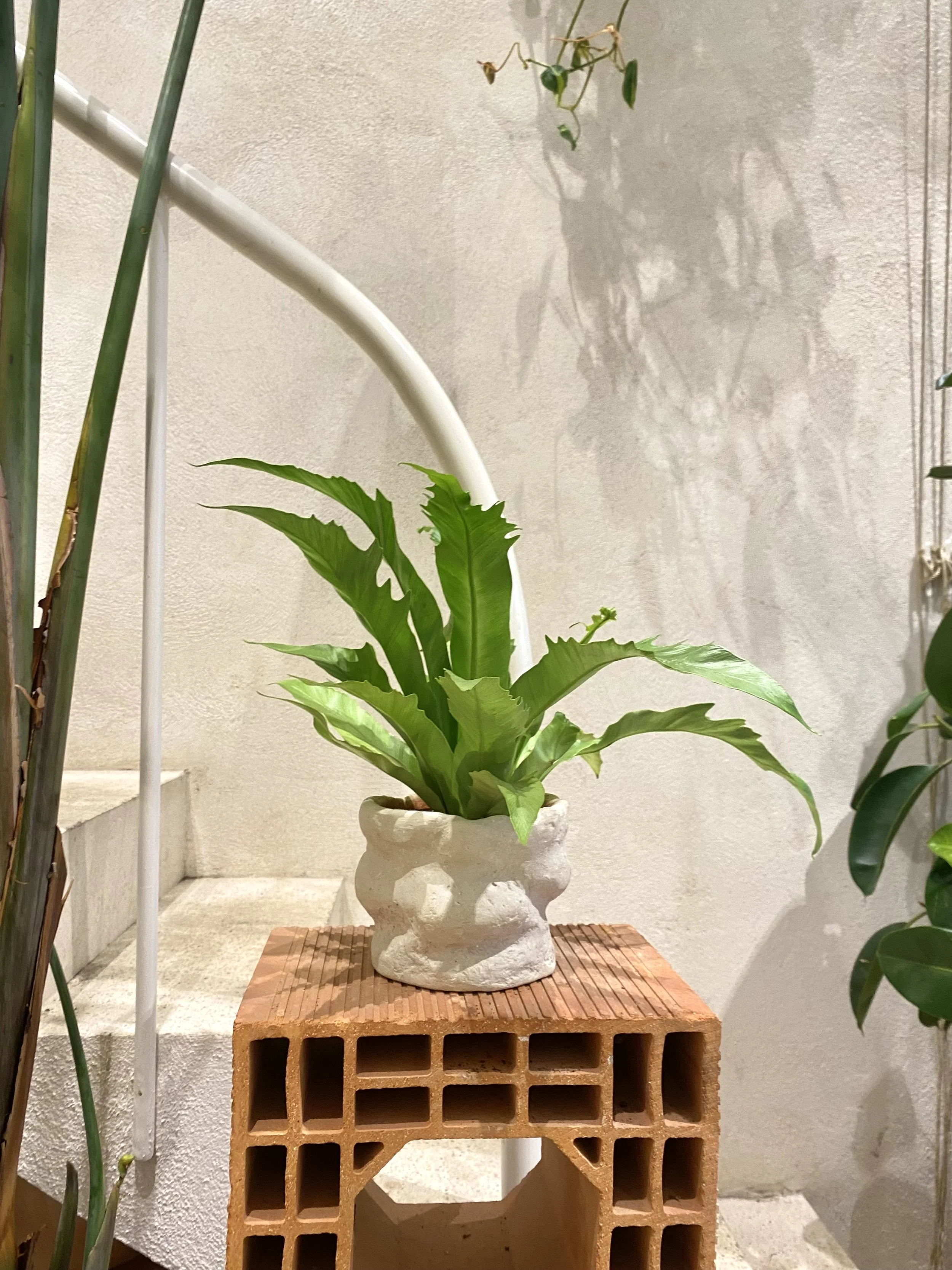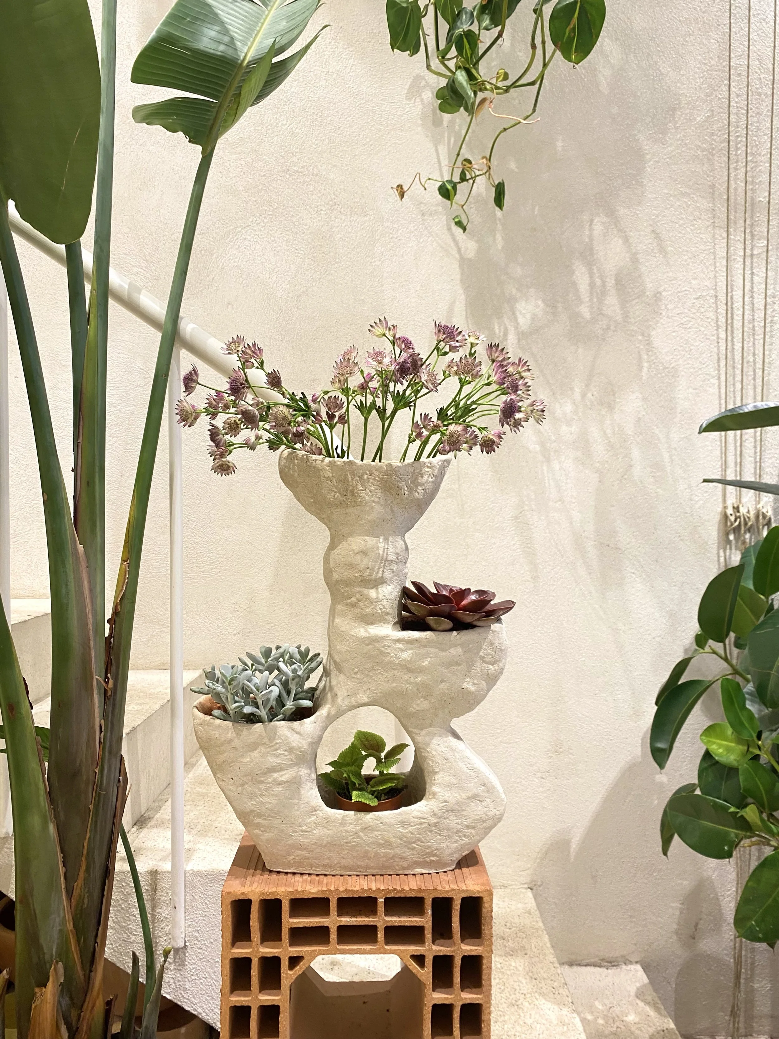 Une collection sculpturale qui réinvente la frontière entre vase et cache-pot. Trois pièces complémentaires aux formes uniques, façonnées en béton de chanvre pour sublimer plantes et fleurs.