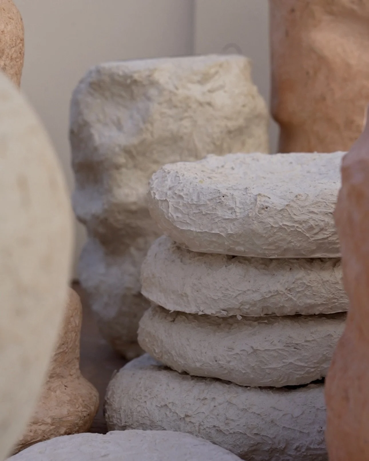 Ma démarche s’inscrit dans une logique de recherche continue. Je suis en perpétuelle exploration des potentialités de cette matière, cherchant à repousser ses limites tout en respectant ses qualités intrinsèques. J’expérimente aussi des combinaisons avec d’autres matériaux naturels – fibres, terres, bois, minéraux – afin de les valoriser ensemble et créer de nouvelles textures, de nouveaux récits. Chaque pièce devient alors le fruit d’un dialogue entre matière, geste et intention.